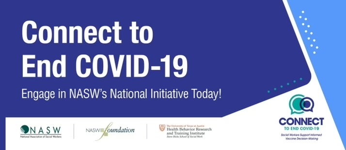 The Connect to End COVID-19 initiative is a partnership between the NASW and the Health Behavior Research and Training Institute (HBRT) at The University of Texas at Austin Steve Hicks School of Social Work. This effort is funded by the Centers for Disease Control and Prevention. The partnership includes national webinars, and virtual chapter hosted skills trainings on using Motivational Interviewing (MI) and Screening, Brief Intervention and Referral to Treatment (SBIRT) to support clients in vaccination decision making. Both are free and provide free CEUs.